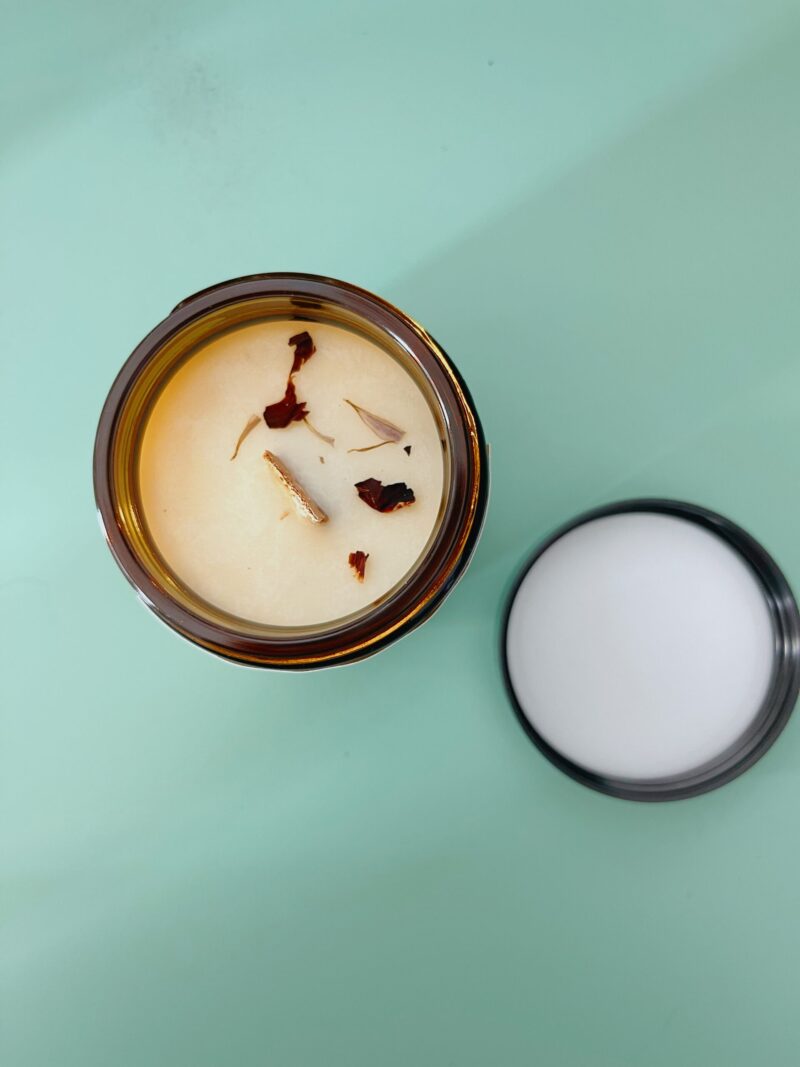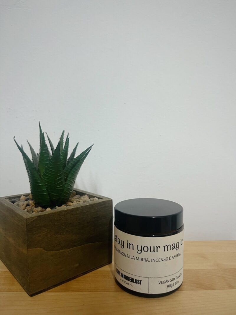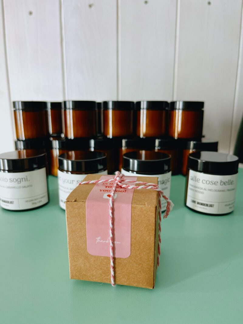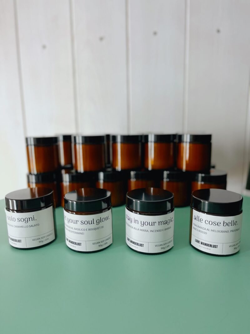Colata a mano in vasetto di vetro da 90g, durata 20 ore. Prodotto artigianale, realizzato in Italia, ecologico, biodegradabile, vegano e cruelty free.