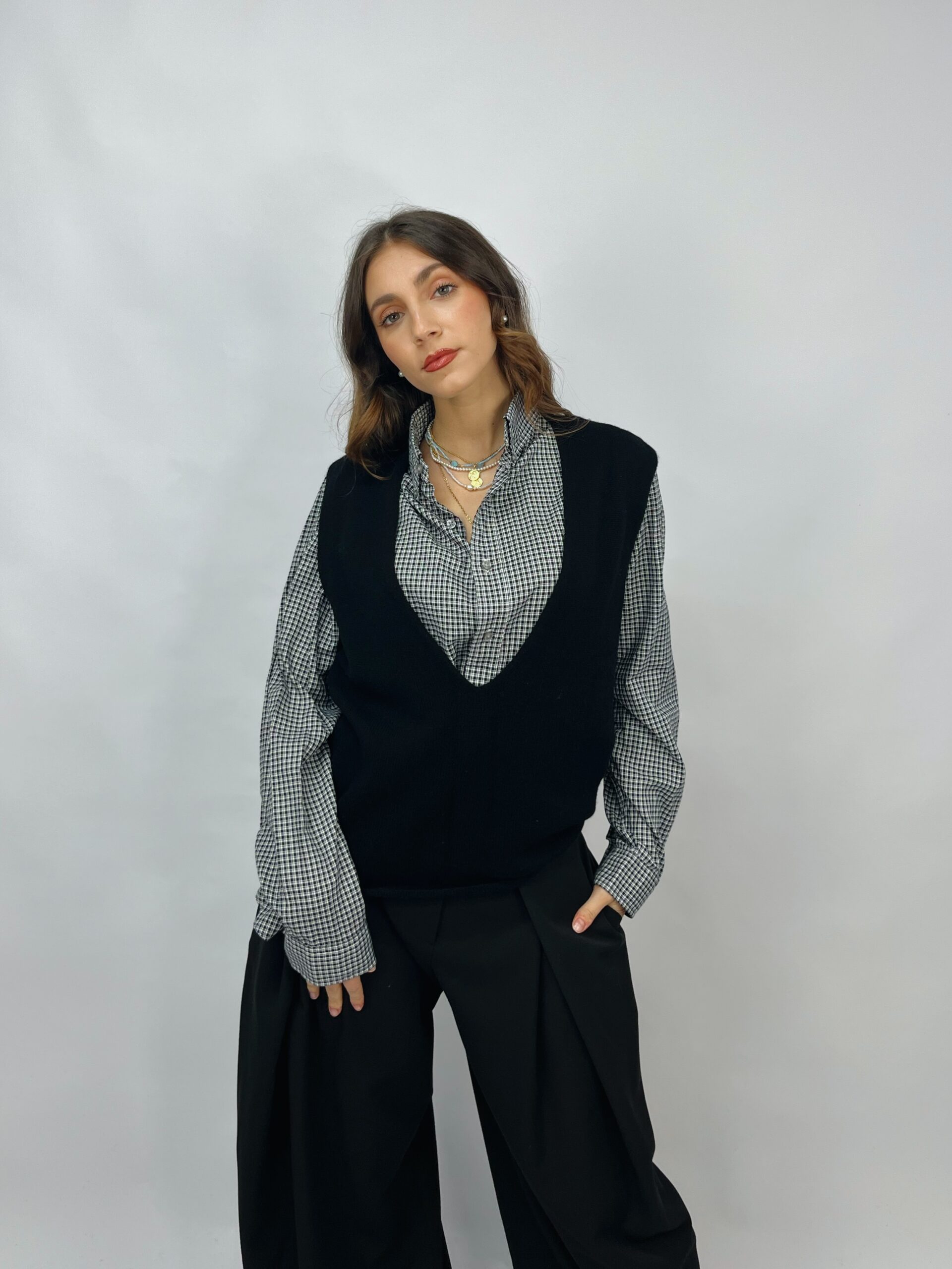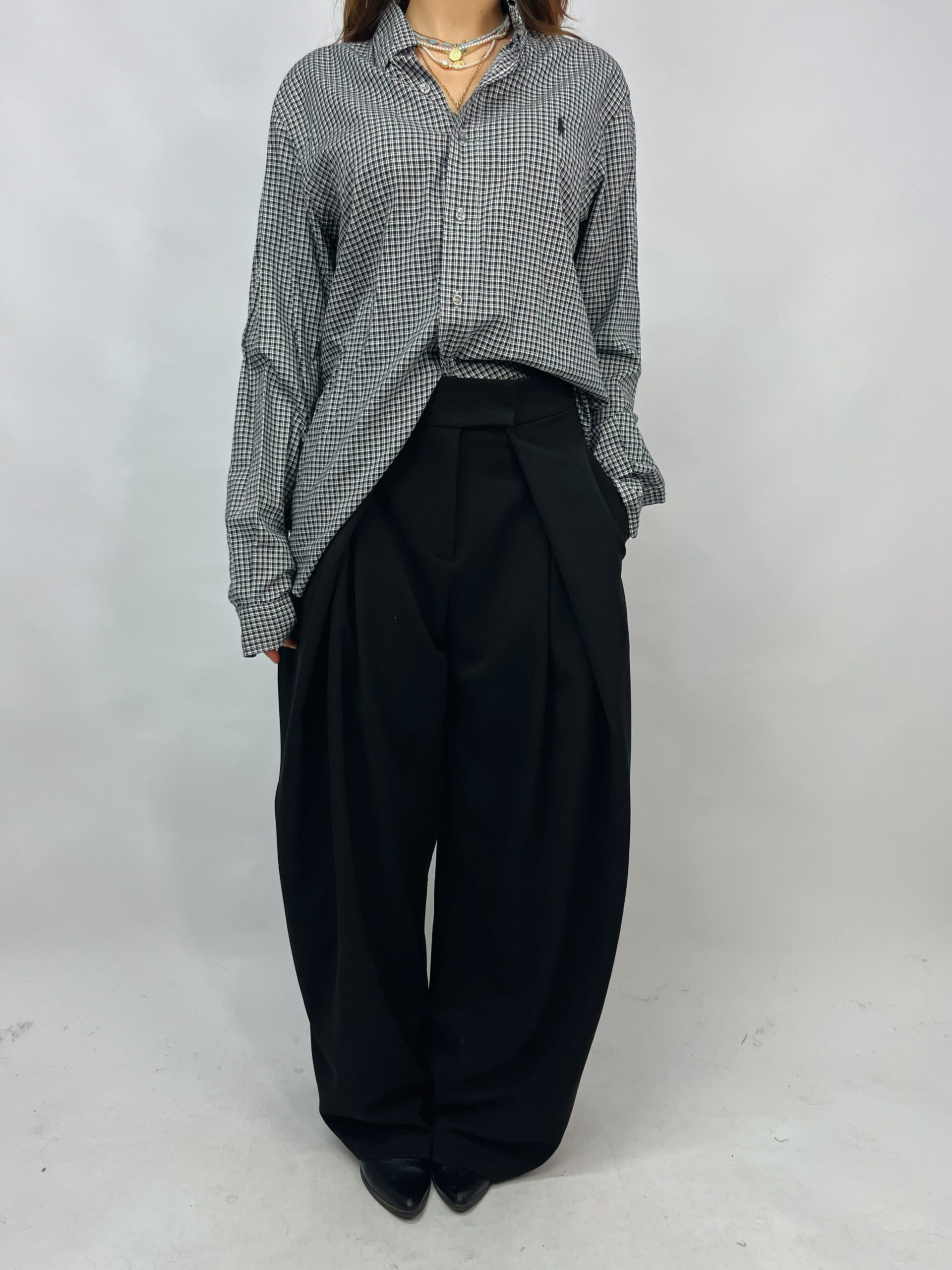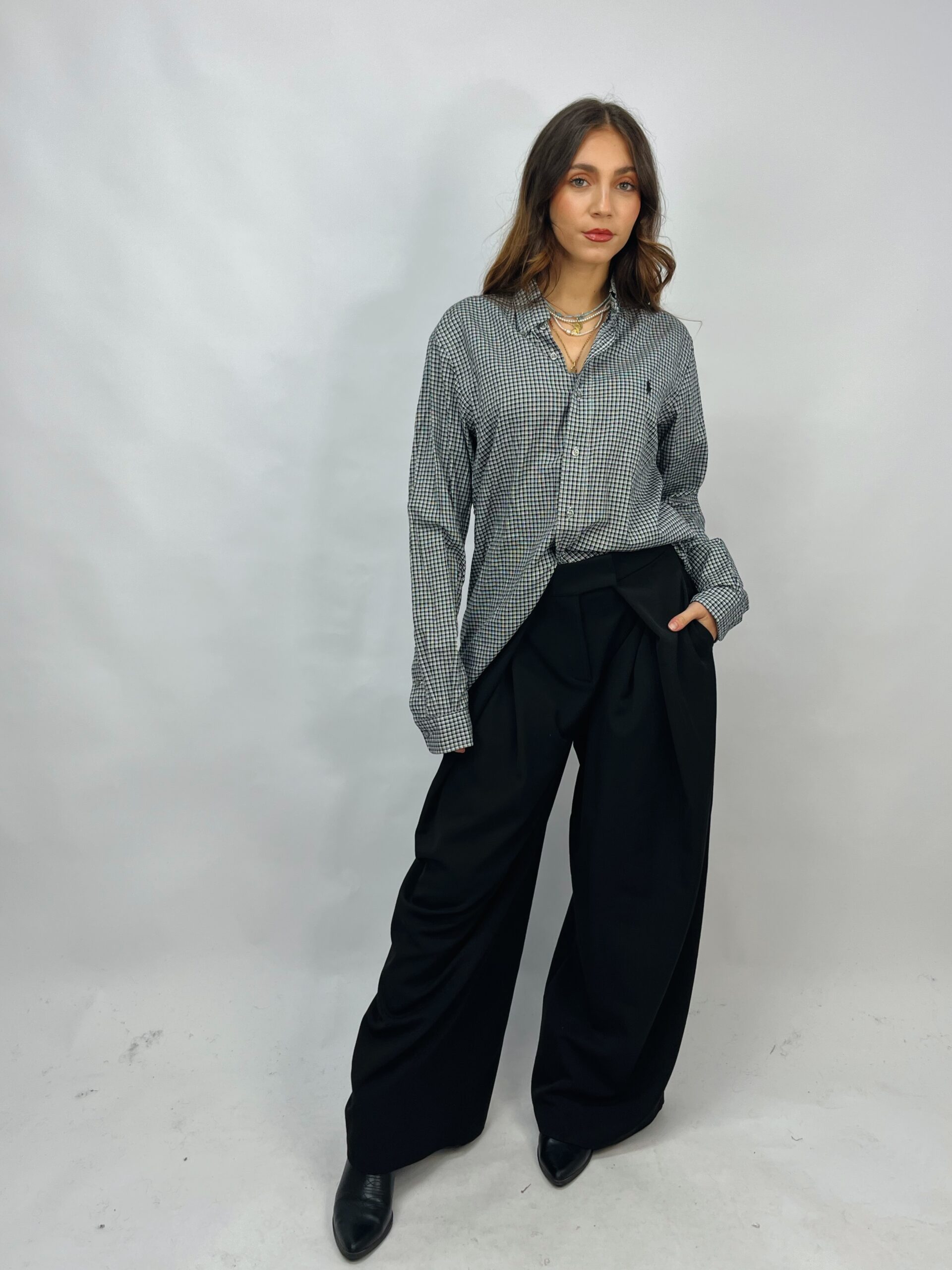 Vestibilità: vita regolare senza elastico, ma tessuto morbido ed invernale. Gamba a palazzo ampia con pieghe sul fianco.