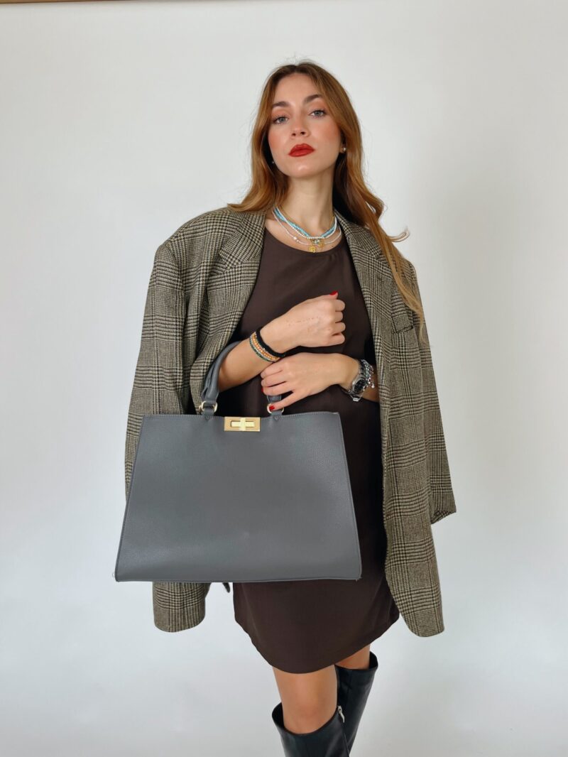 Borsa in ecopelle con doppio manico rigido e tracolla regolabile. Capienza grande, interno foderato, chiusura con gancetto.